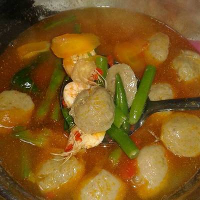 Lagi pengen makan siang yang seger dan berkuah. Bahan dasar yang digunakan pada resep tom yam kali ini adalah udang ikan kakap dan bakso ikan. Tom yam seafood juga dilengkapi dengan aneka sayuran seperti wortel jamur merang dan kembang kol.